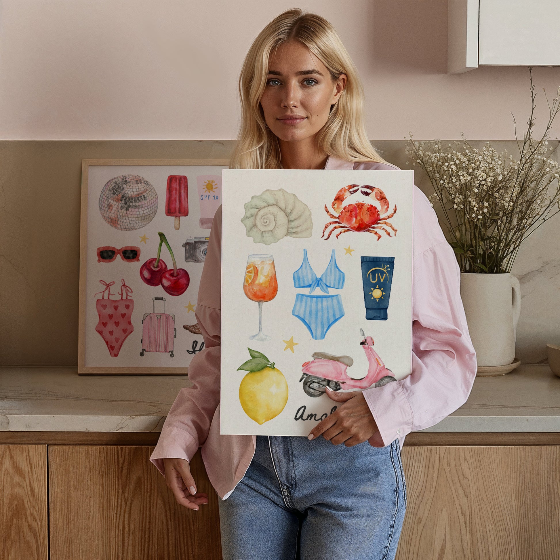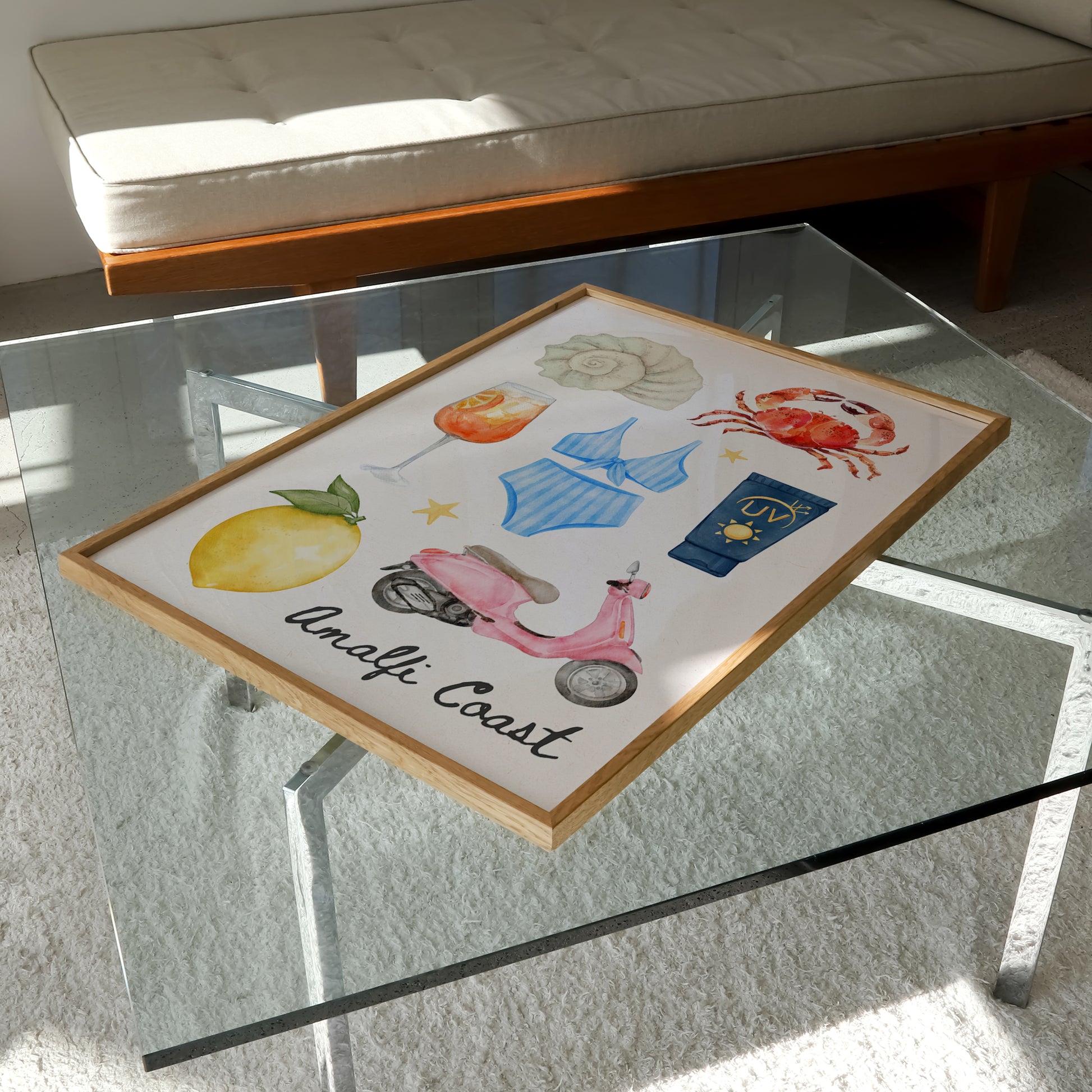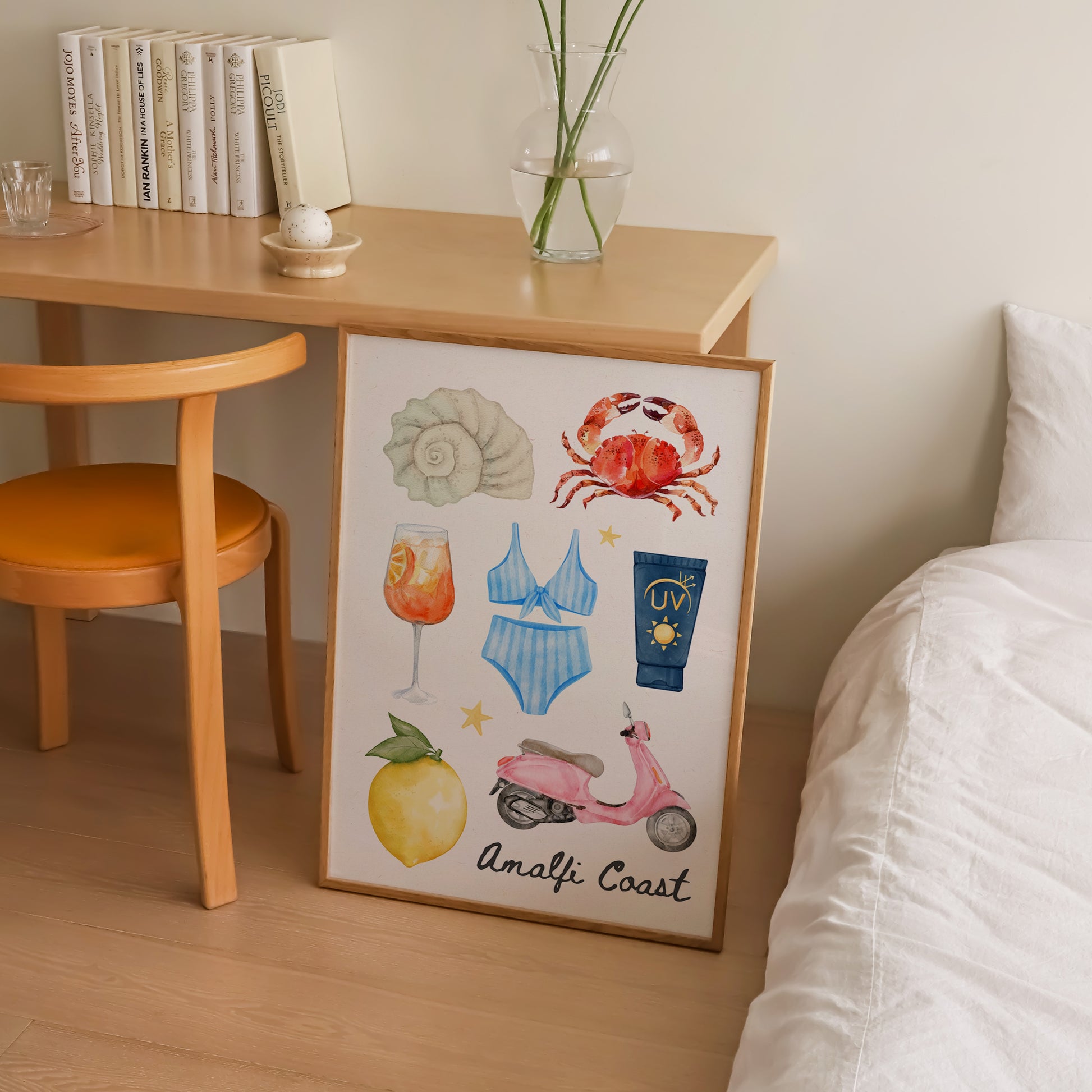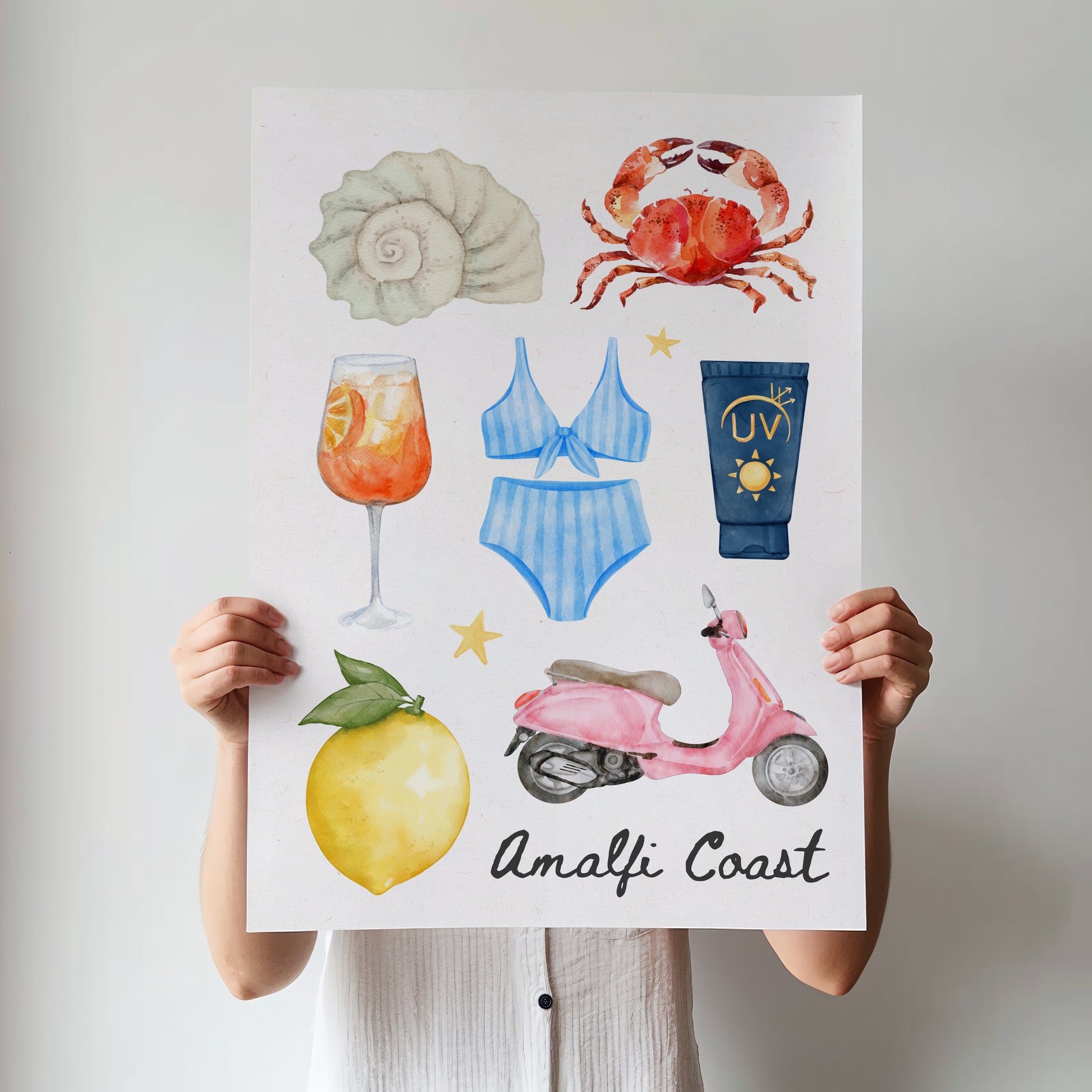 A funky, vintage moodboard featuring iconic sights and symbols of the Amalfi Coast. A versatile wall print that brings Amalfi nostalgia to your bedroom, hallway, kitchen, or living room.