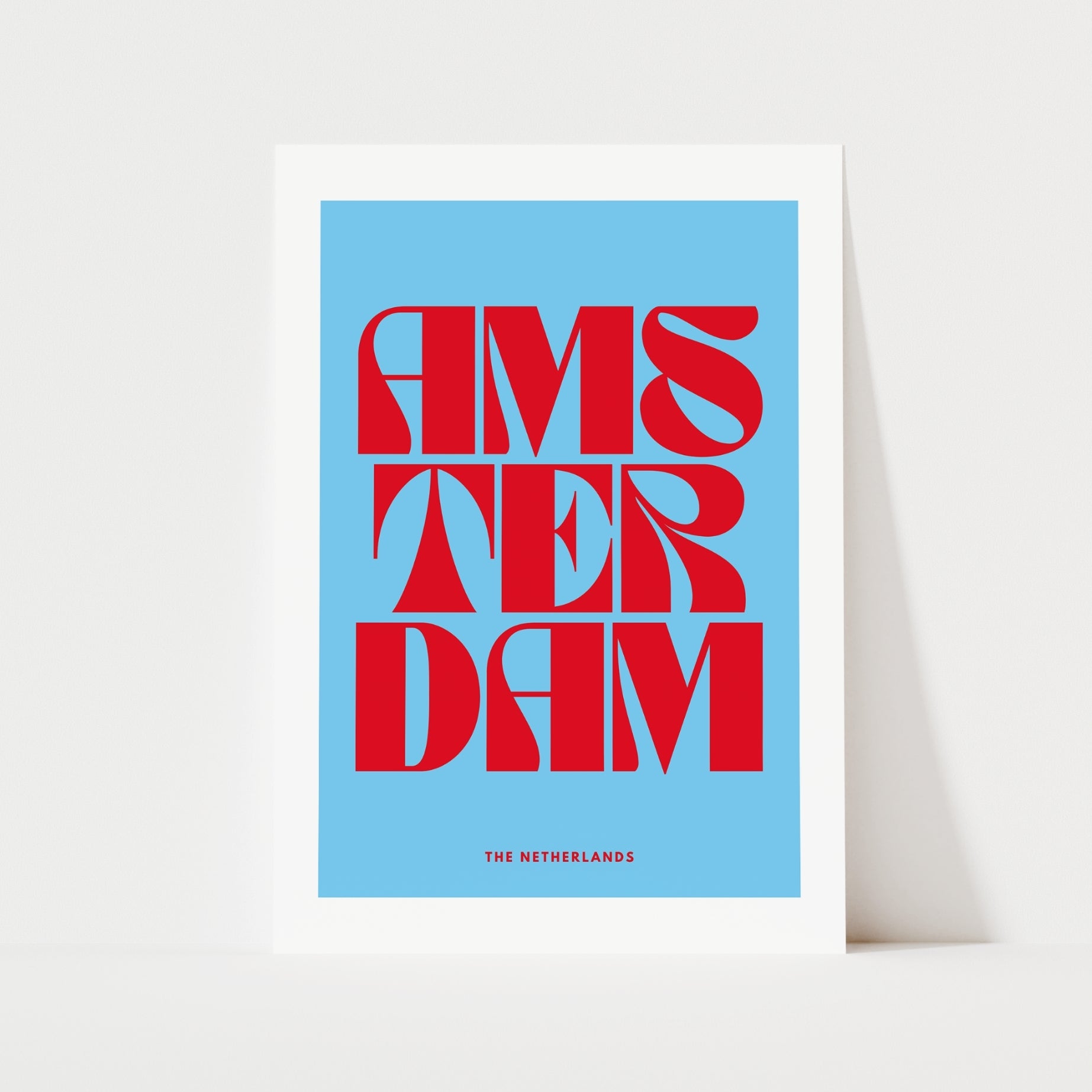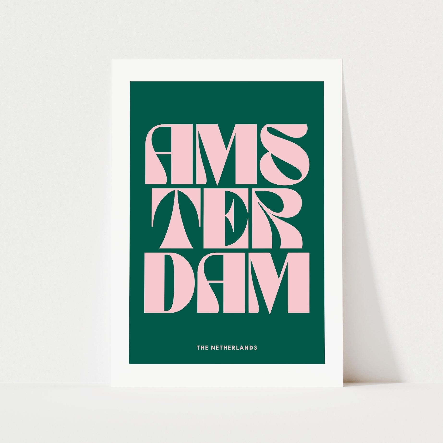 A quirky travel print with the text "AMSTERDAM" in a funky font with "THE NETHERLANDS" in smaller text below. Available in black & white, green & pink, pink & red, or blue & red.