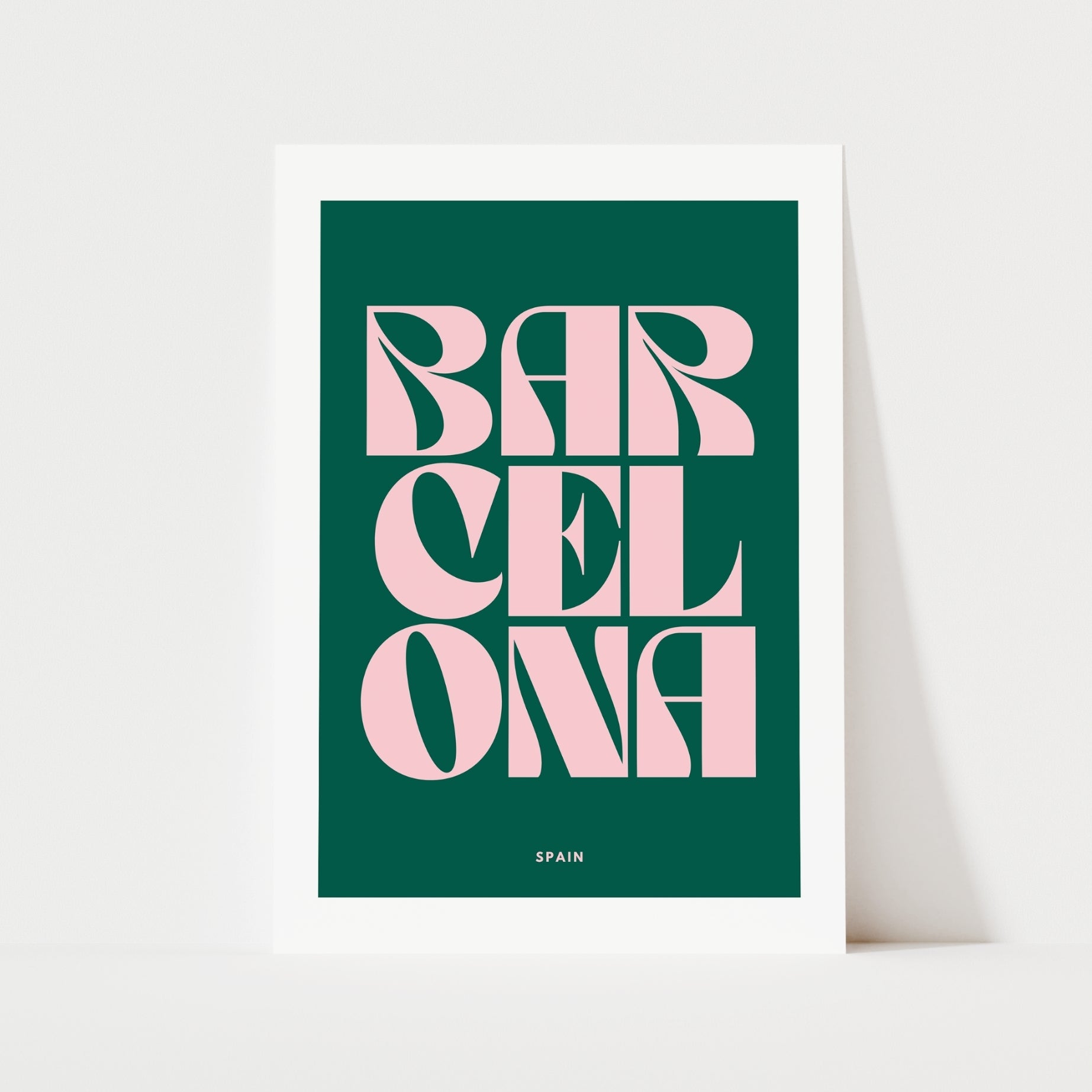 A quirky travel print with the text "BARCELONA" in a funky font with "SPAIN" smaller text below. Available in pink & red, black & white, green & pink, or blue & red.
