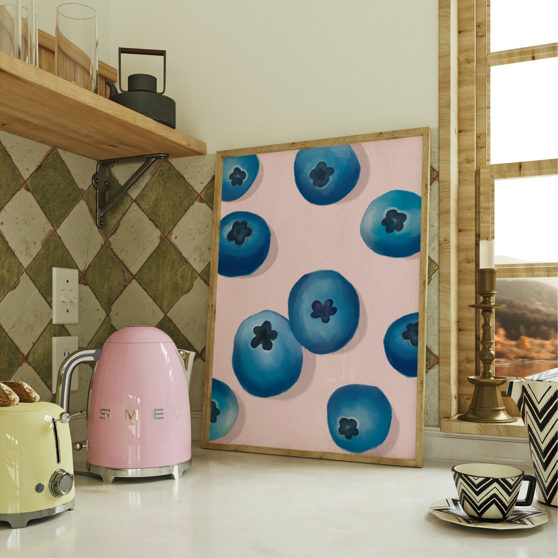 Part of a funky collection of fresh food & drink designs, perfect for your kitchen walls. Graphical painting illustrations of blueberries on a hand-painted style pink or green background.