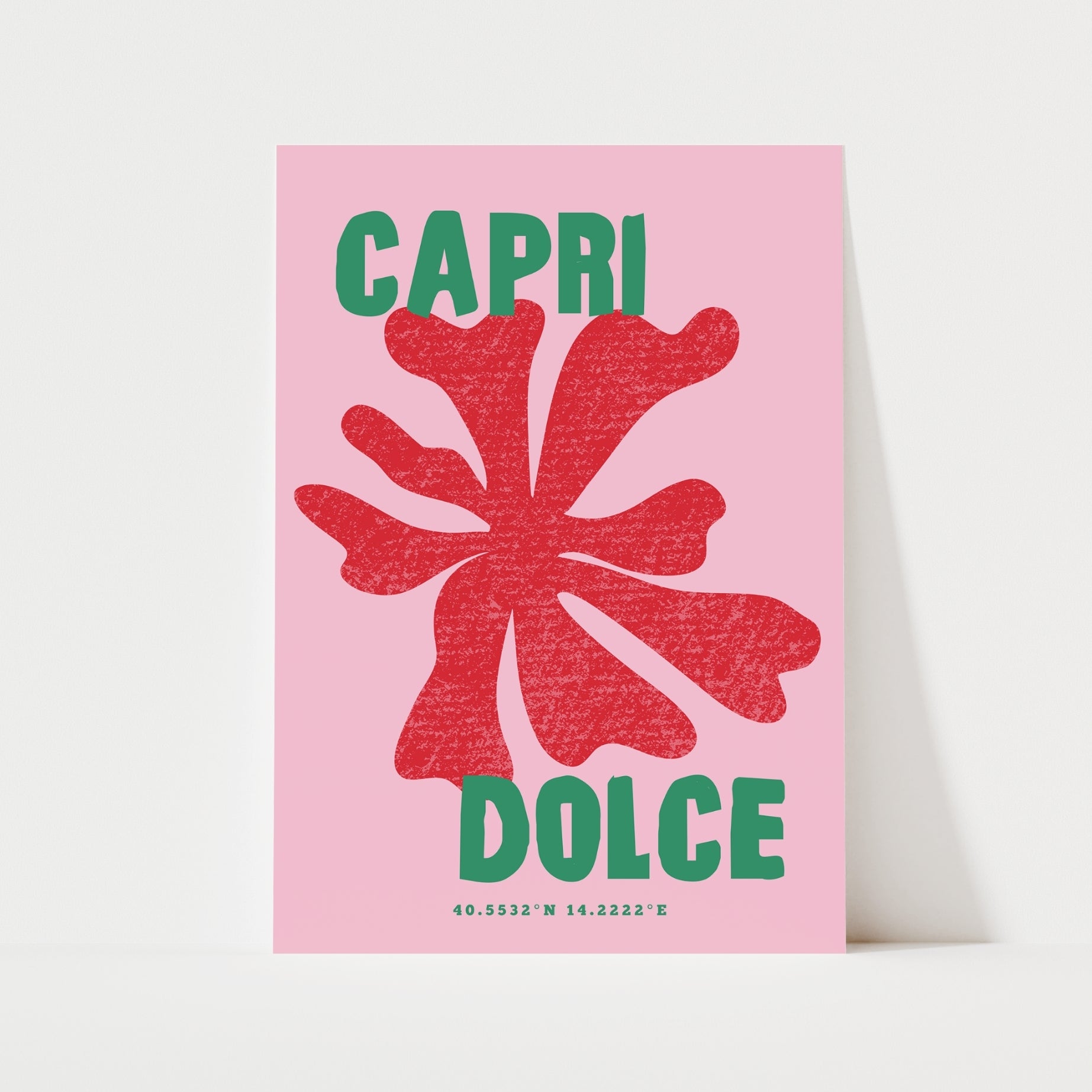 Graphical illustration of an abstract with the text "CAPRI" above and "DOLCE" below, with the coordinates underneath. Available in pink & orange, green & red, or neutral brown tones.
