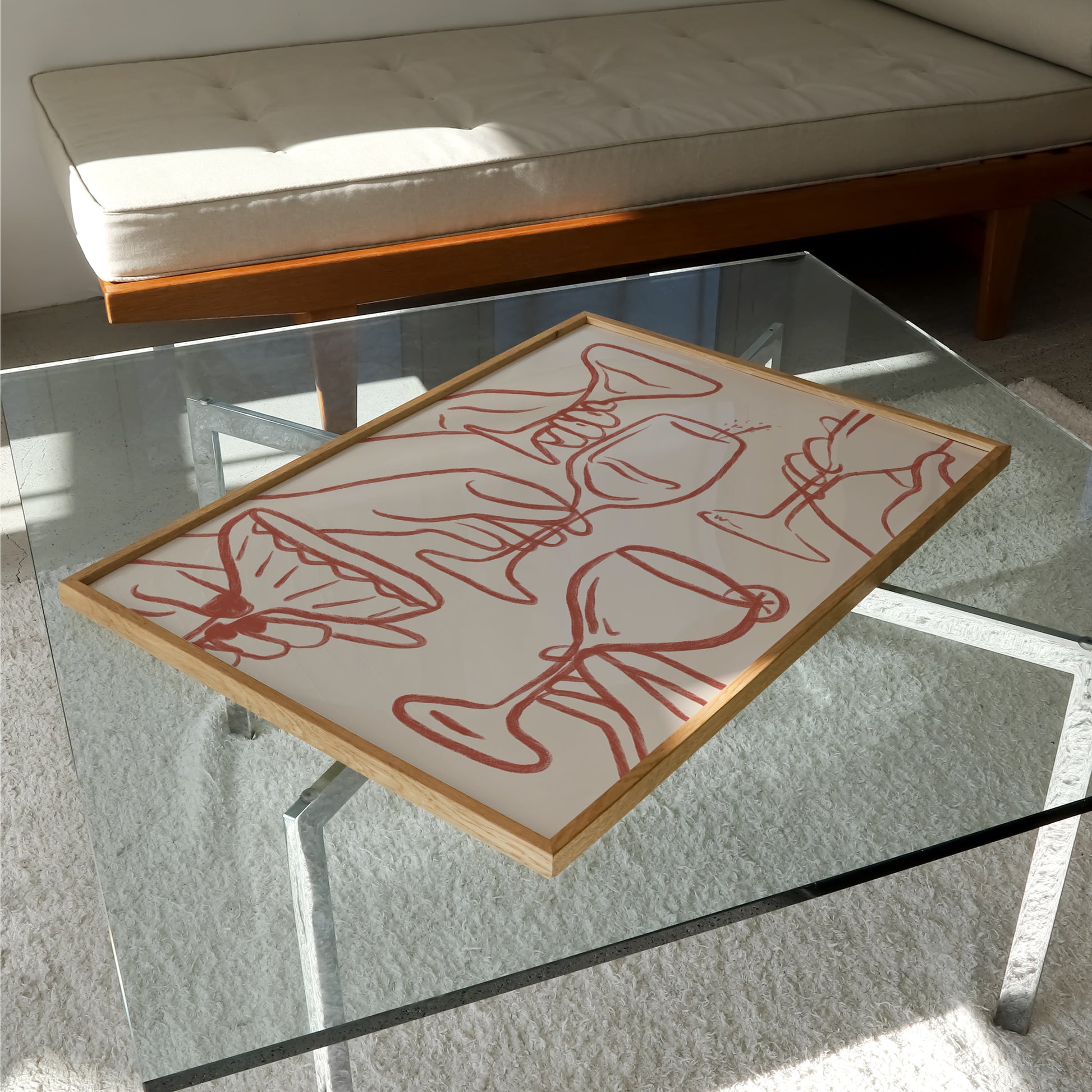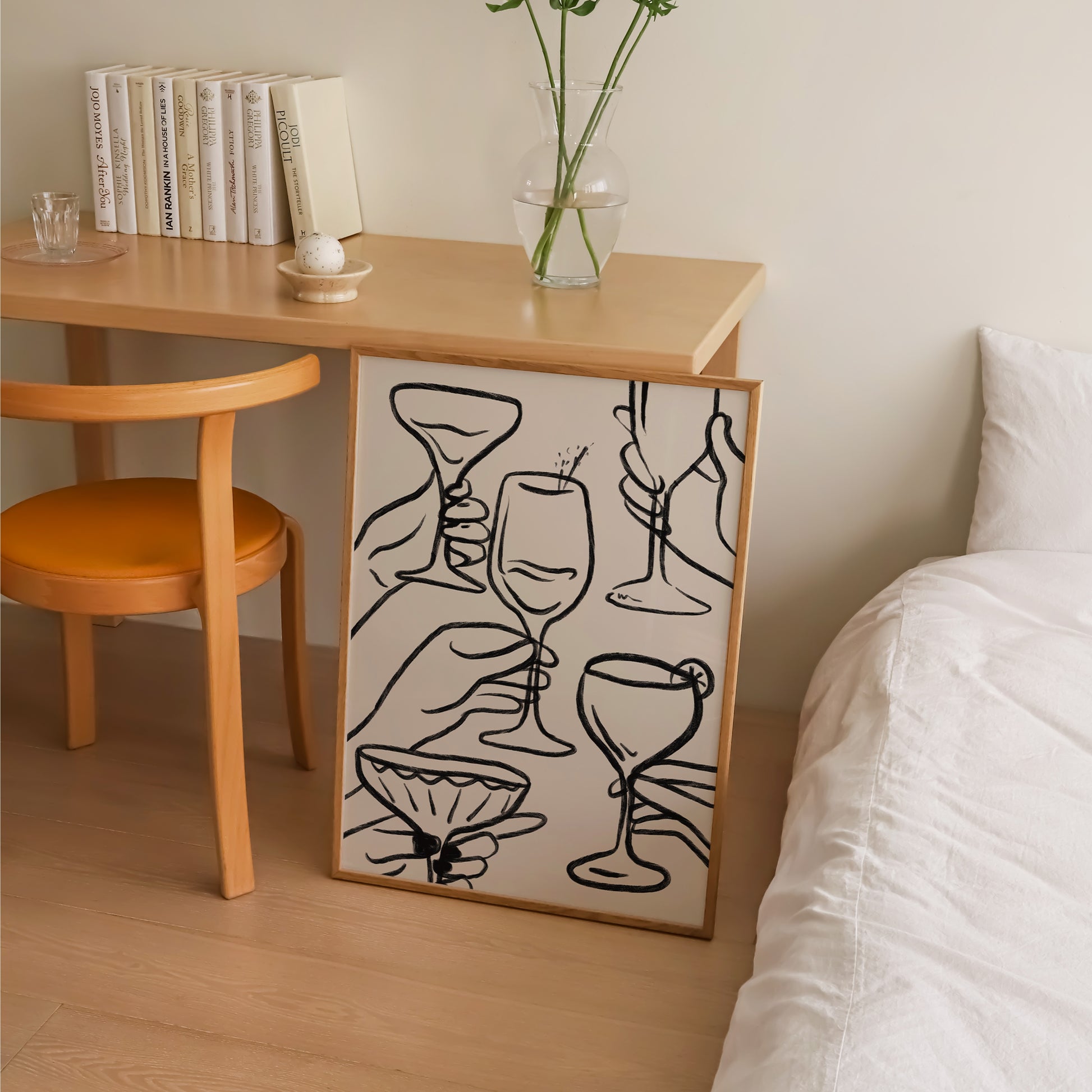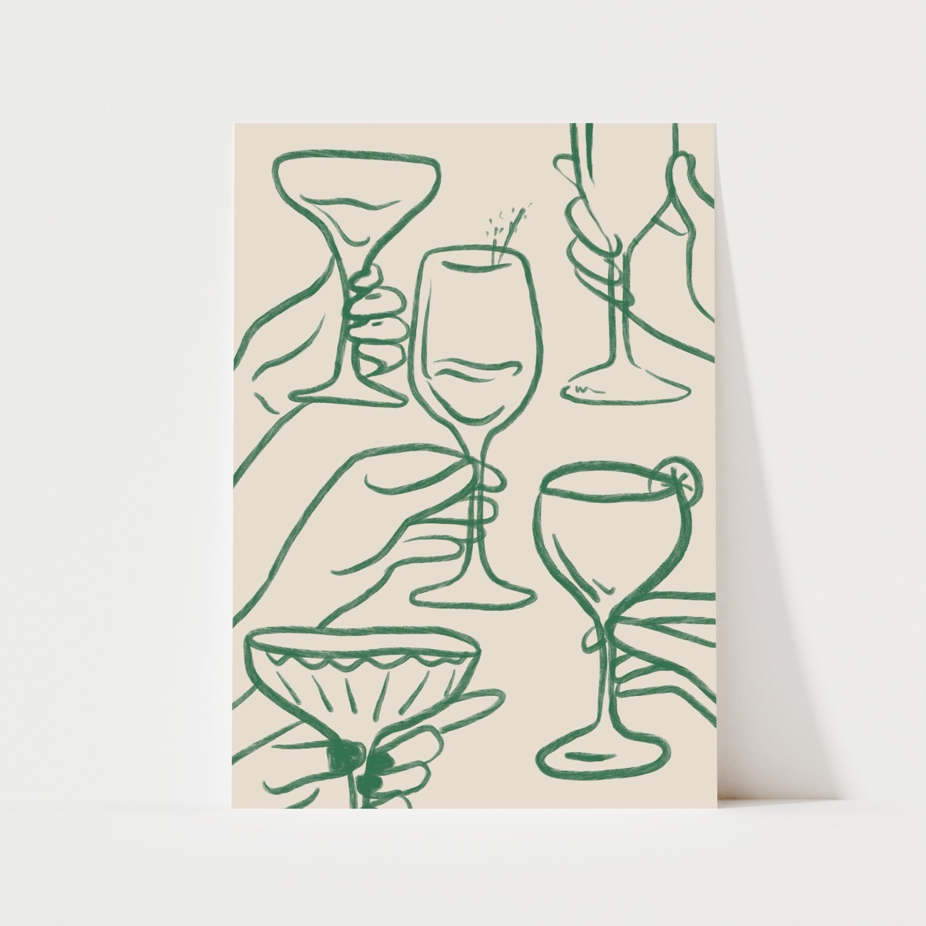 A funky kitchen print for the wine lovers. Five hand-drawn illustrations of hands holding a glass of wine or cocktail in black, green, red, or brown, or multi-colours on an off-white background.