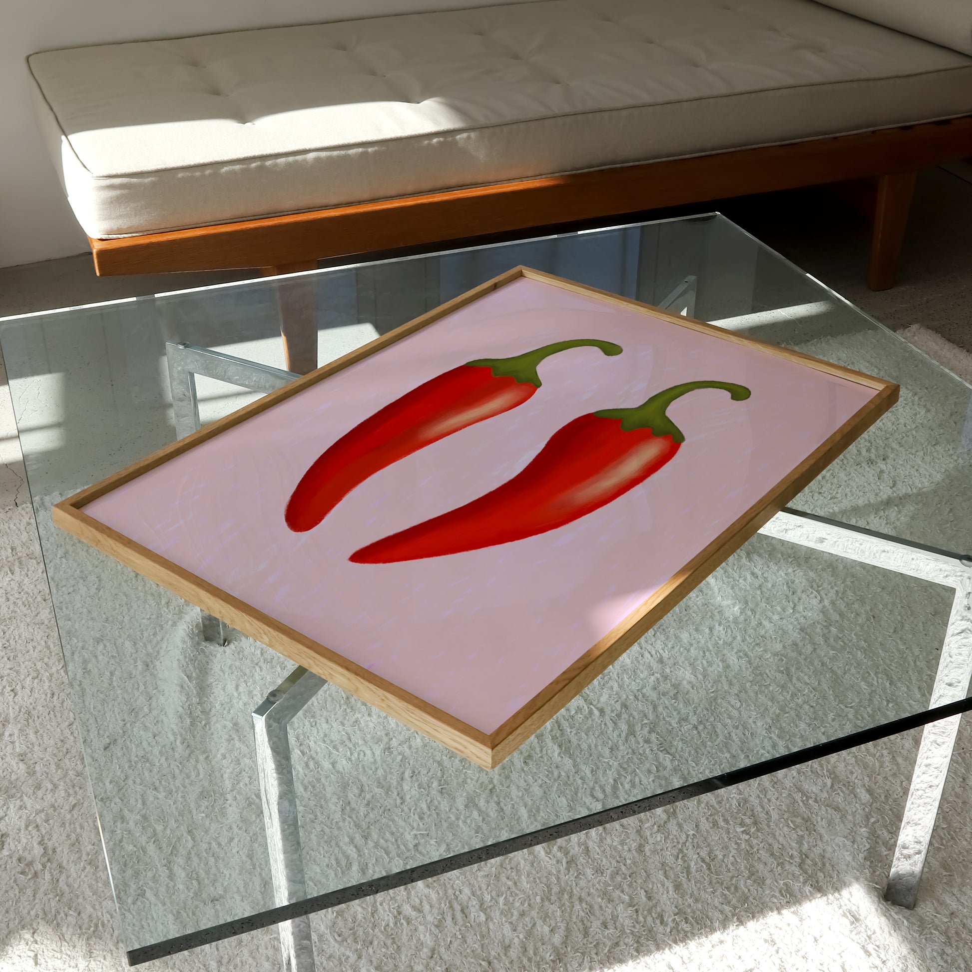 Part of a funky collection of fresh food & drink designs, perfect for your kitchen walls. Graphical painting illustrations of two red chillies on a hand-painted style pink or blue background.