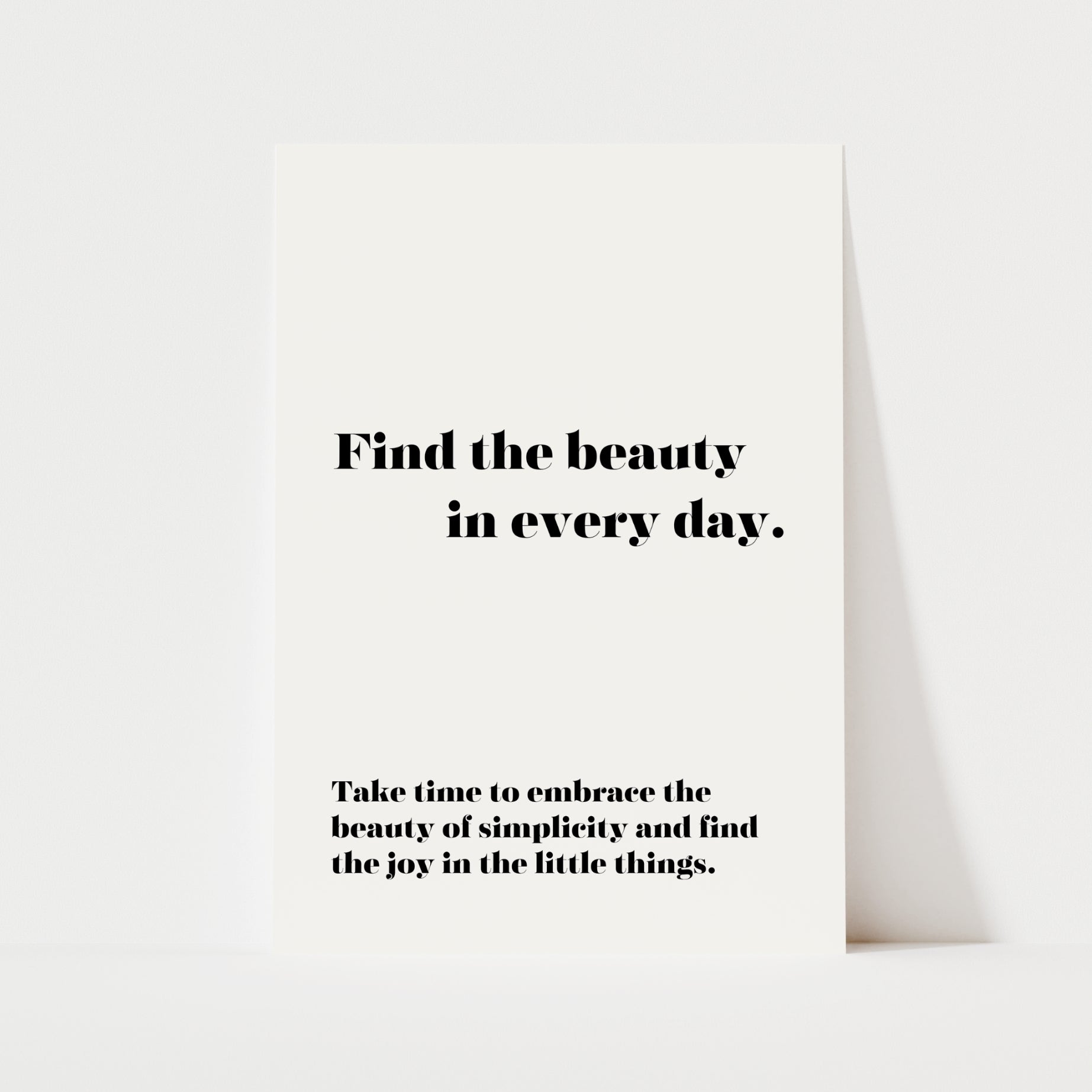 Add a little wholesome motivation to your bedroom, kitchen, office, or living room. The text "Find the beauty in every day" with additional text below in black font on a white background.