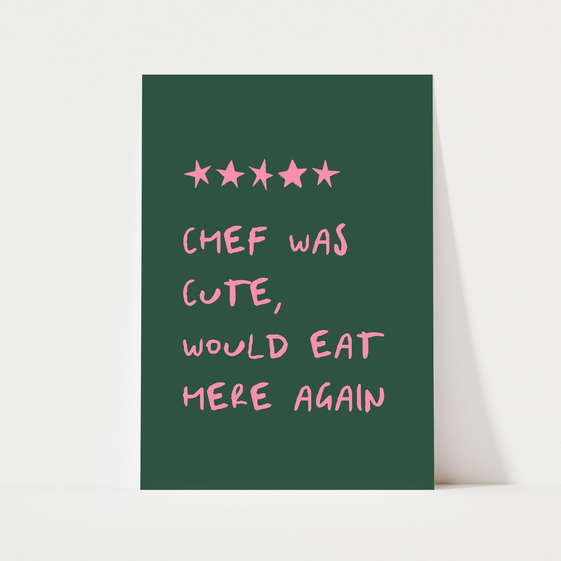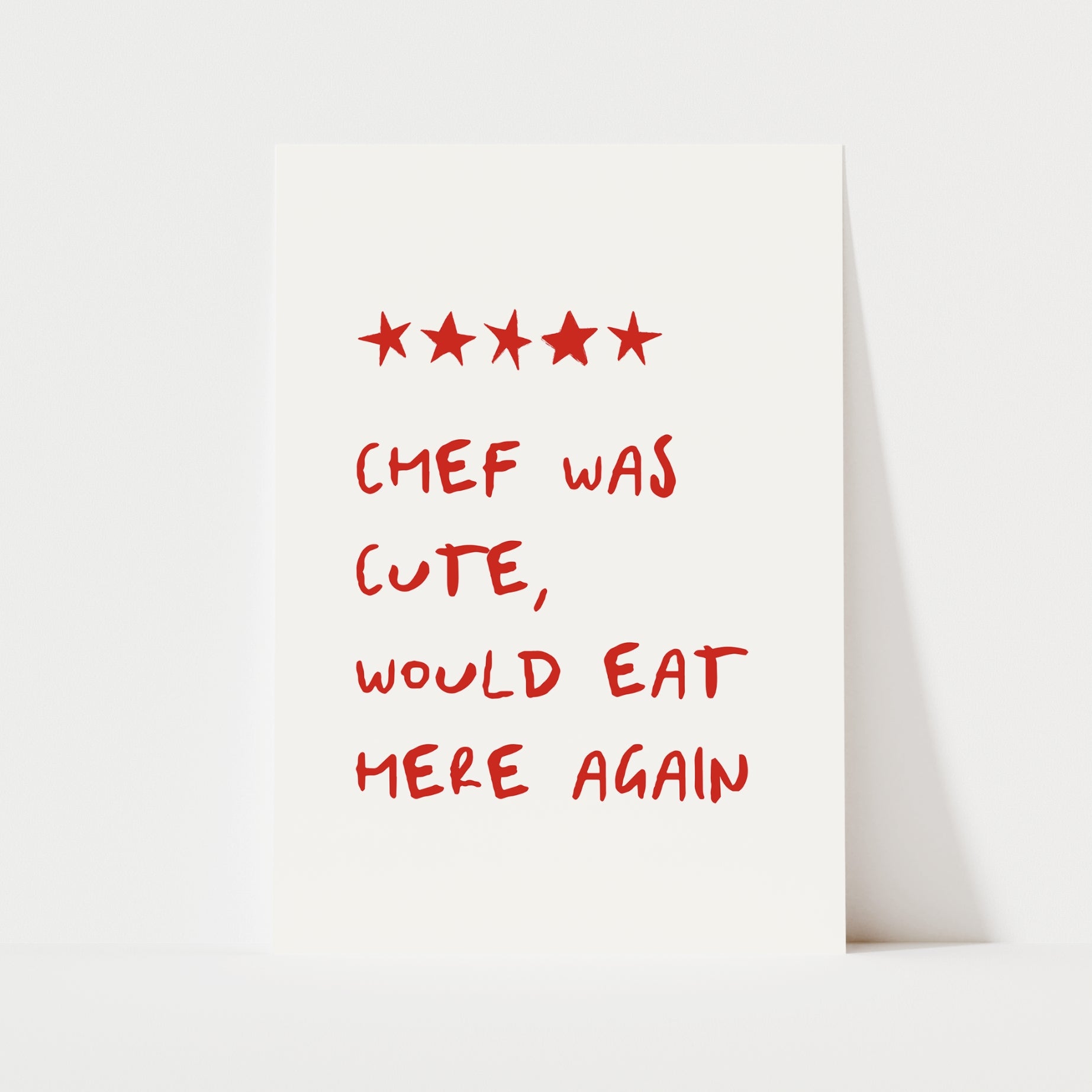 Funny chef review kitchen print featuring illustrations of five red stars and the text "CHEF WAS CUTE, WOULD EAT HERE AGAIN" in hand-written font. Available in 5 colours, including green, pink, red, black and blue.