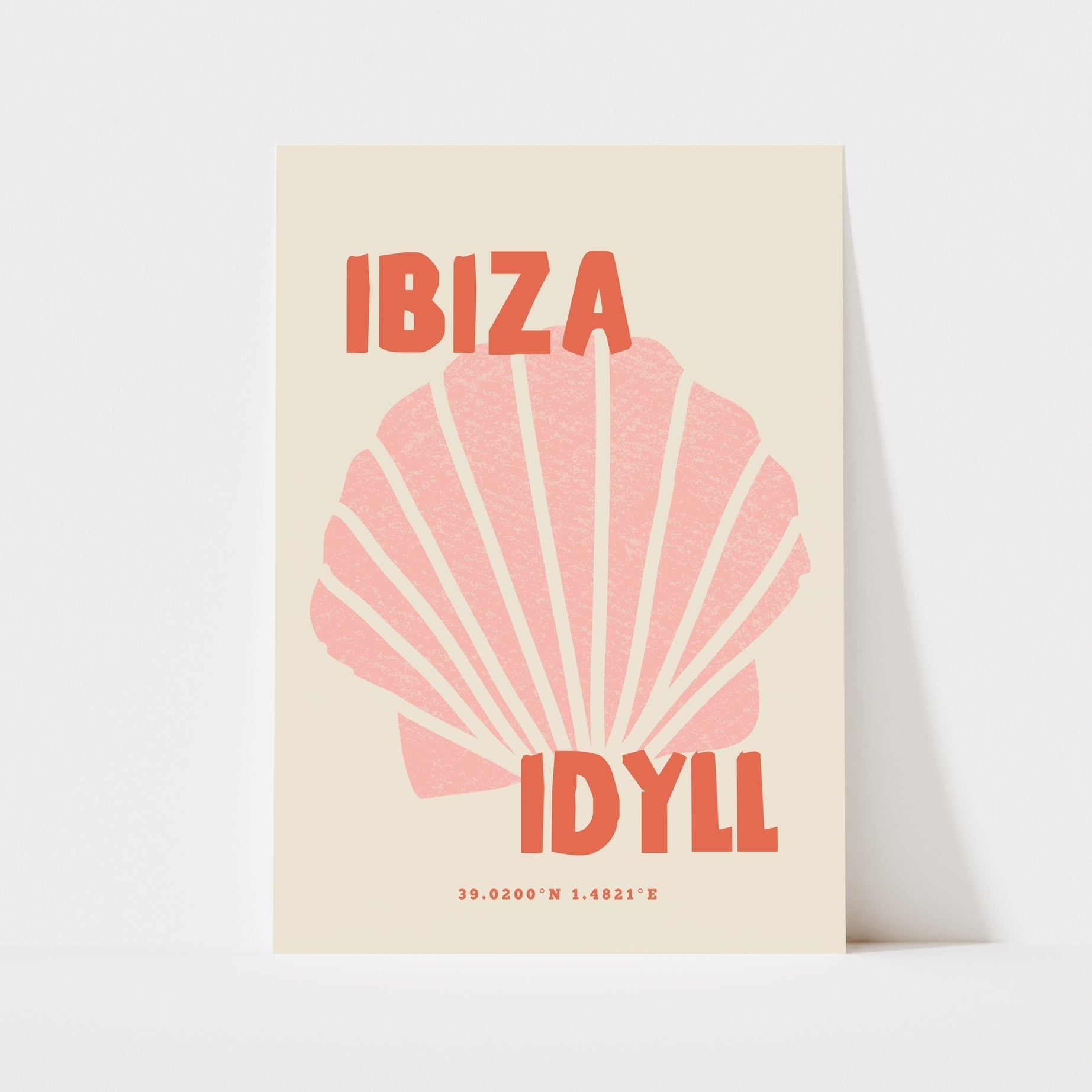 Funky Ibiza wall print with a graphical illustration of a shell with the text "IBIZA" above and "IDYLL" below, with coordinates underneath. Available in peach & orange, pink & blue, pink & yellow, or green & blue.