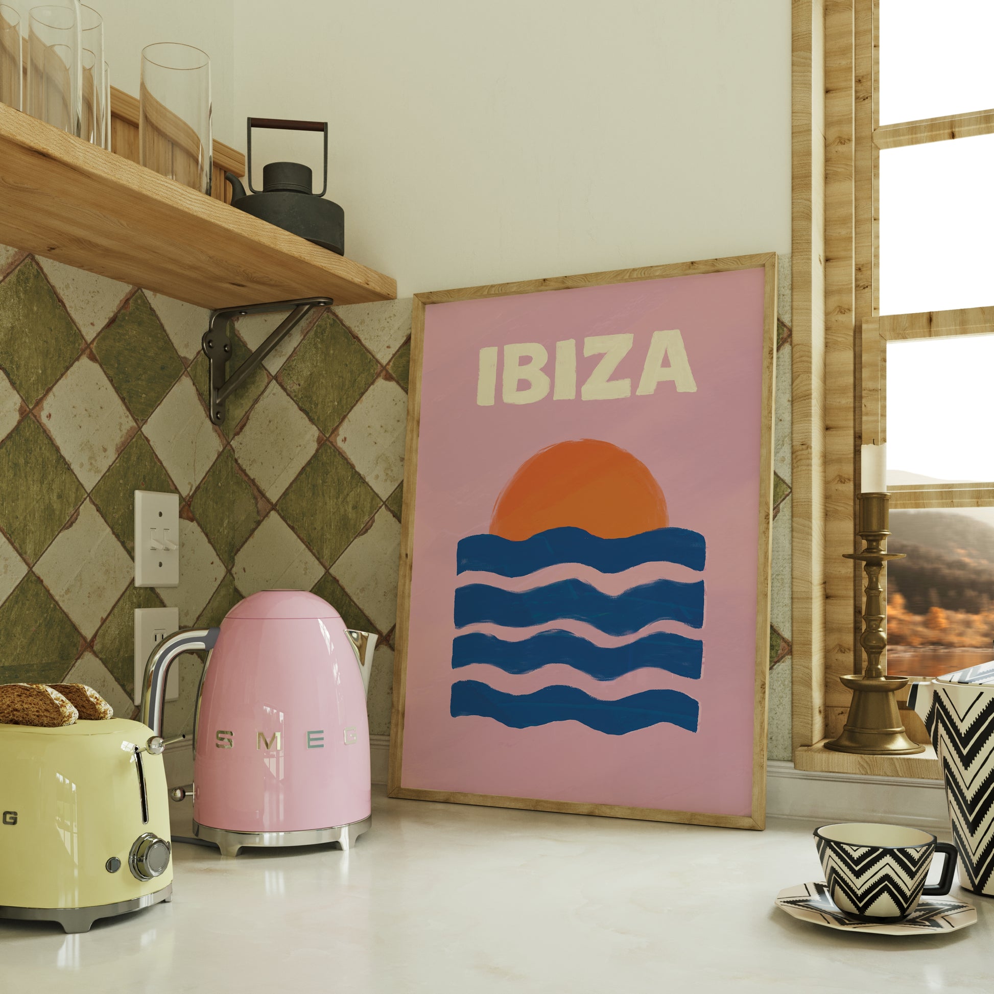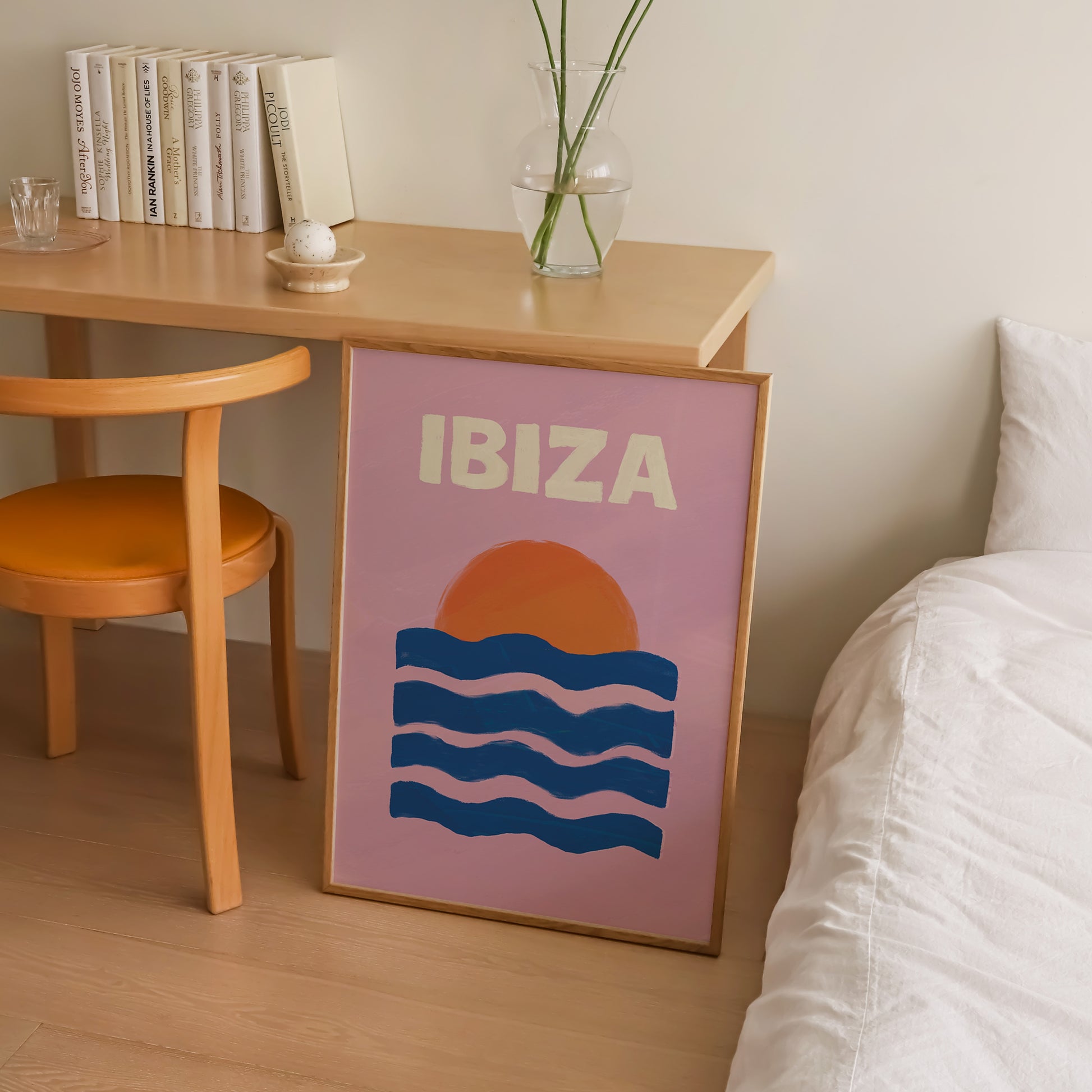 Funky, retro Ibiza print featuring a painted illustration of a bold orange sunset above blue waves on a pink background. Perfect for coastal, boho, and modern interiors, and an ideal piece for Ibiza lovers and summer-inspired decor.