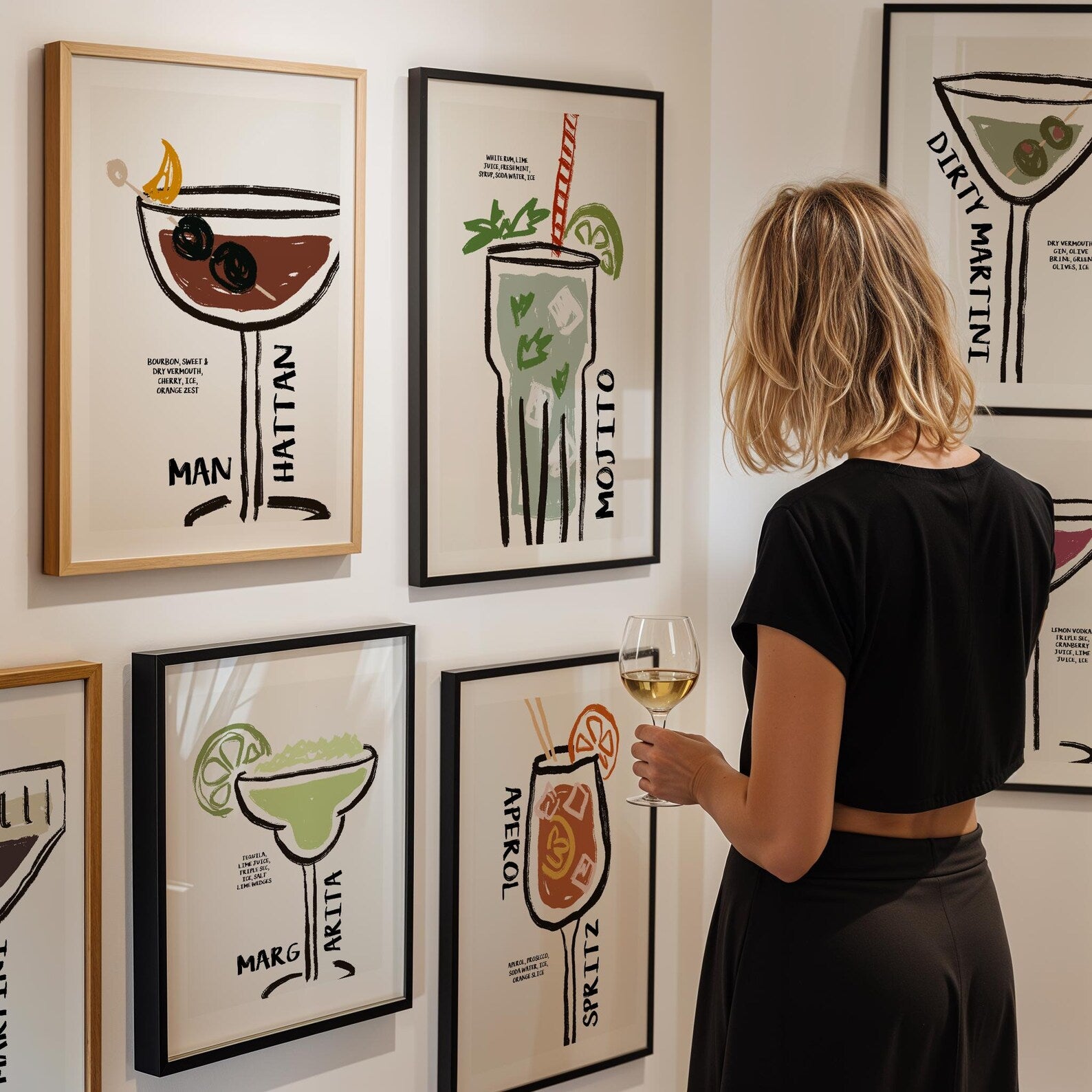 Part of a retro, whimsical collection of classic cocktail designs, perfect for your kitchen walls. The text "MOJITO" with a list of ingredients in handwritten doodle font, surrounding a hand-drawn doodle illustration of a mojito cocktail.