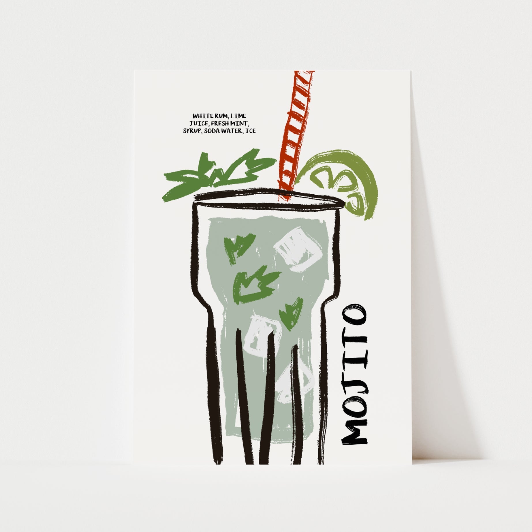 Part of a retro, whimsical collection of classic cocktail designs, perfect for your kitchen walls. The text "MOJITO" with a list of ingredients in handwritten doodle font, surrounding a hand-drawn doodle illustration of a mojito cocktail.