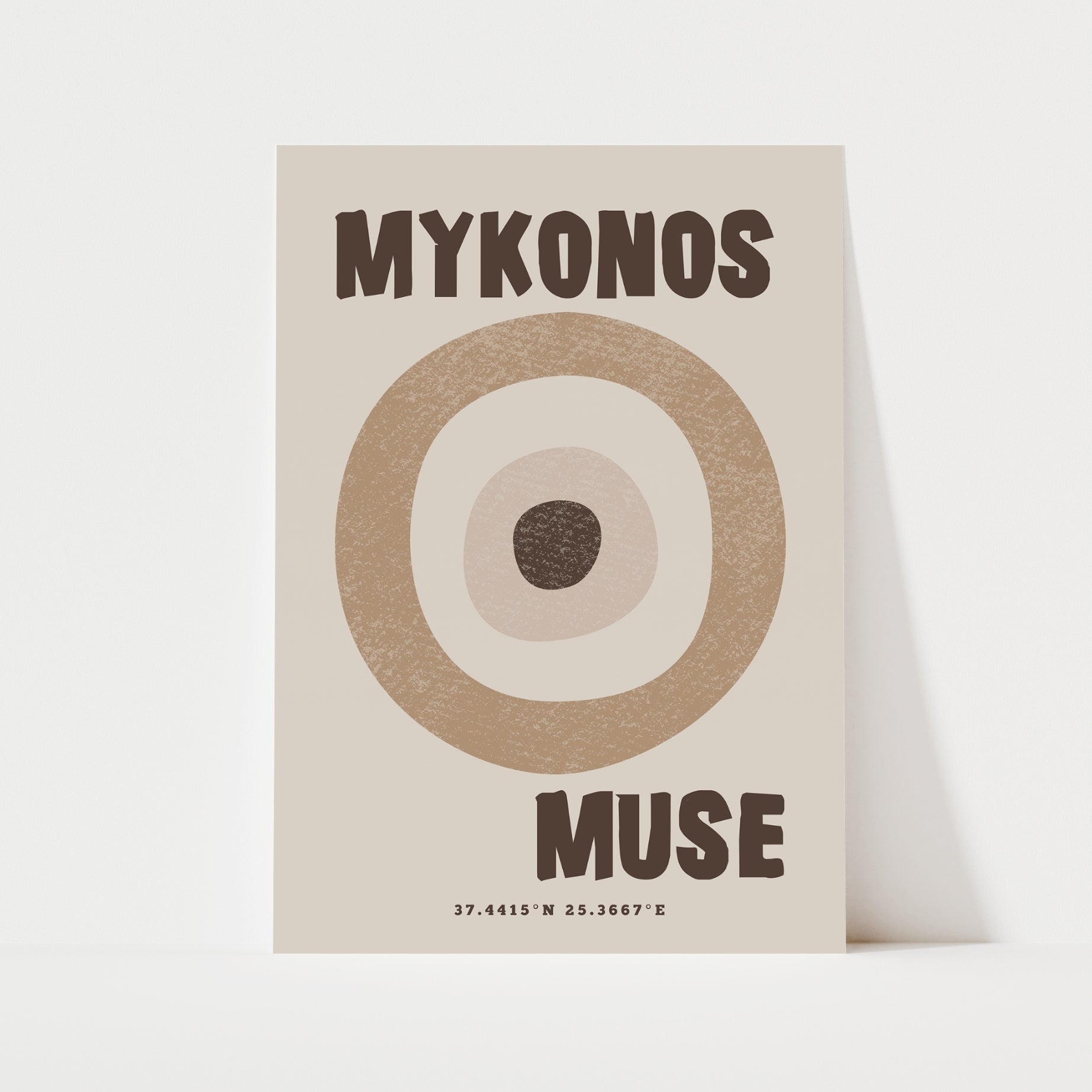 Graphical illustration of the Greek evil eye with the text "MYKONOS" above and "MUSE" below, with coordinates underneath. Available in blue, green & pink, or neutral brown tones.