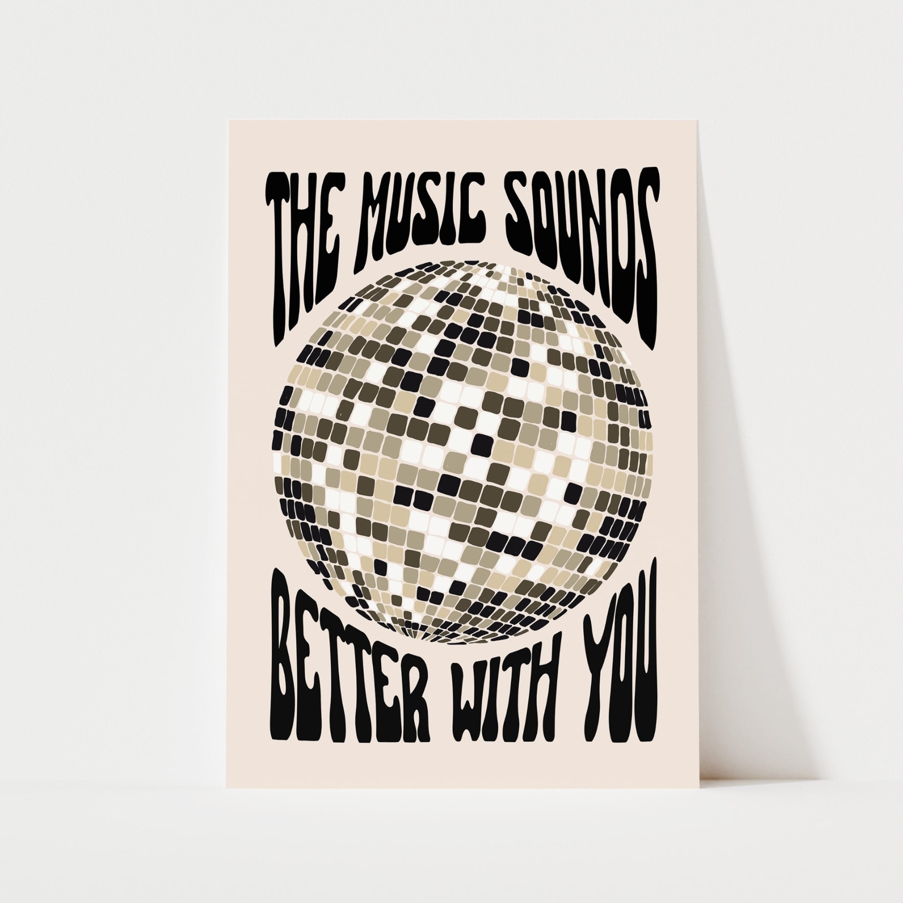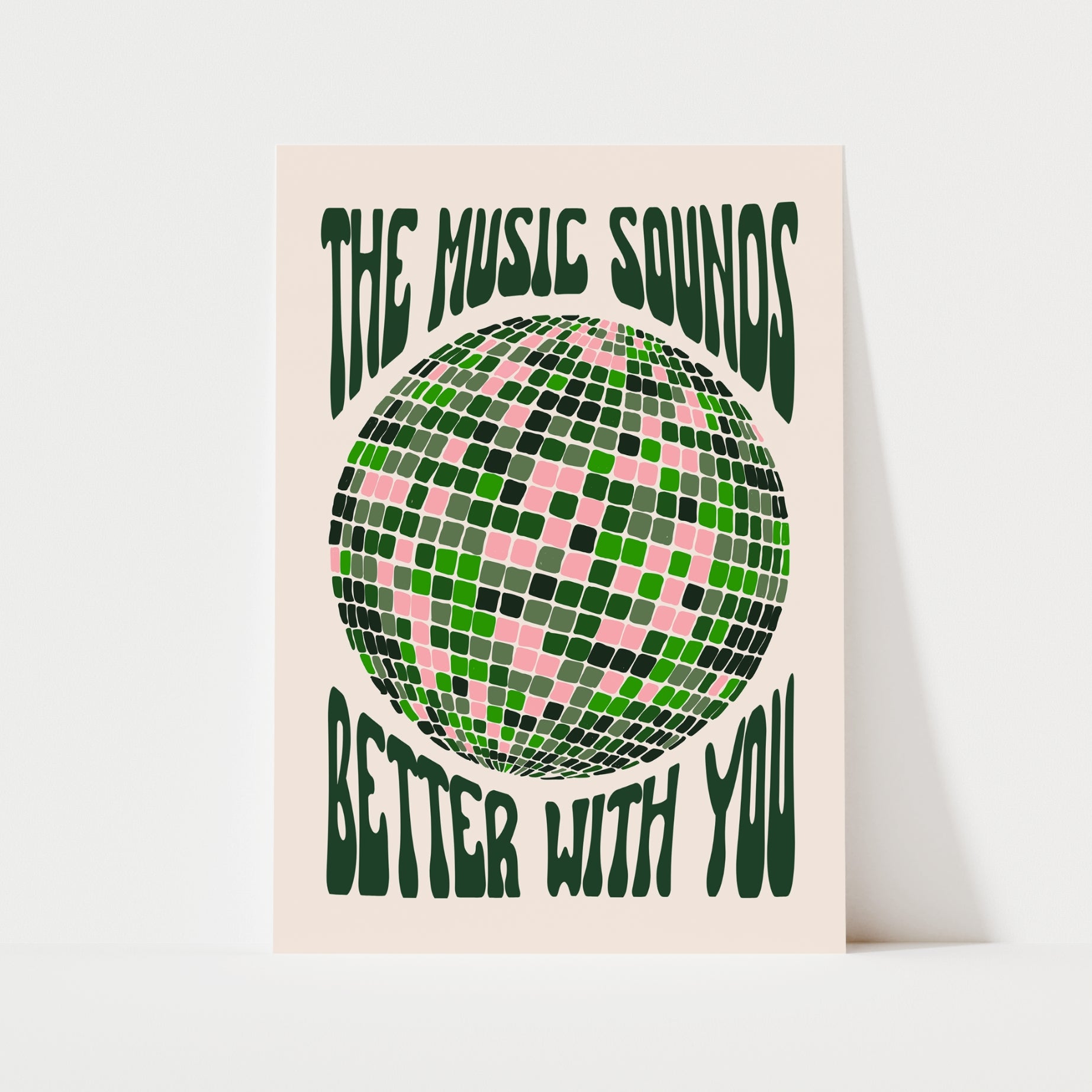 Decorate your walls with this funky music inspired print. A digital hand-drawn illustration of a glitter disco ball with the text "THE MUSIC SOUNDS BETTER WITH YOU" above and below. Available in green, red, or black.