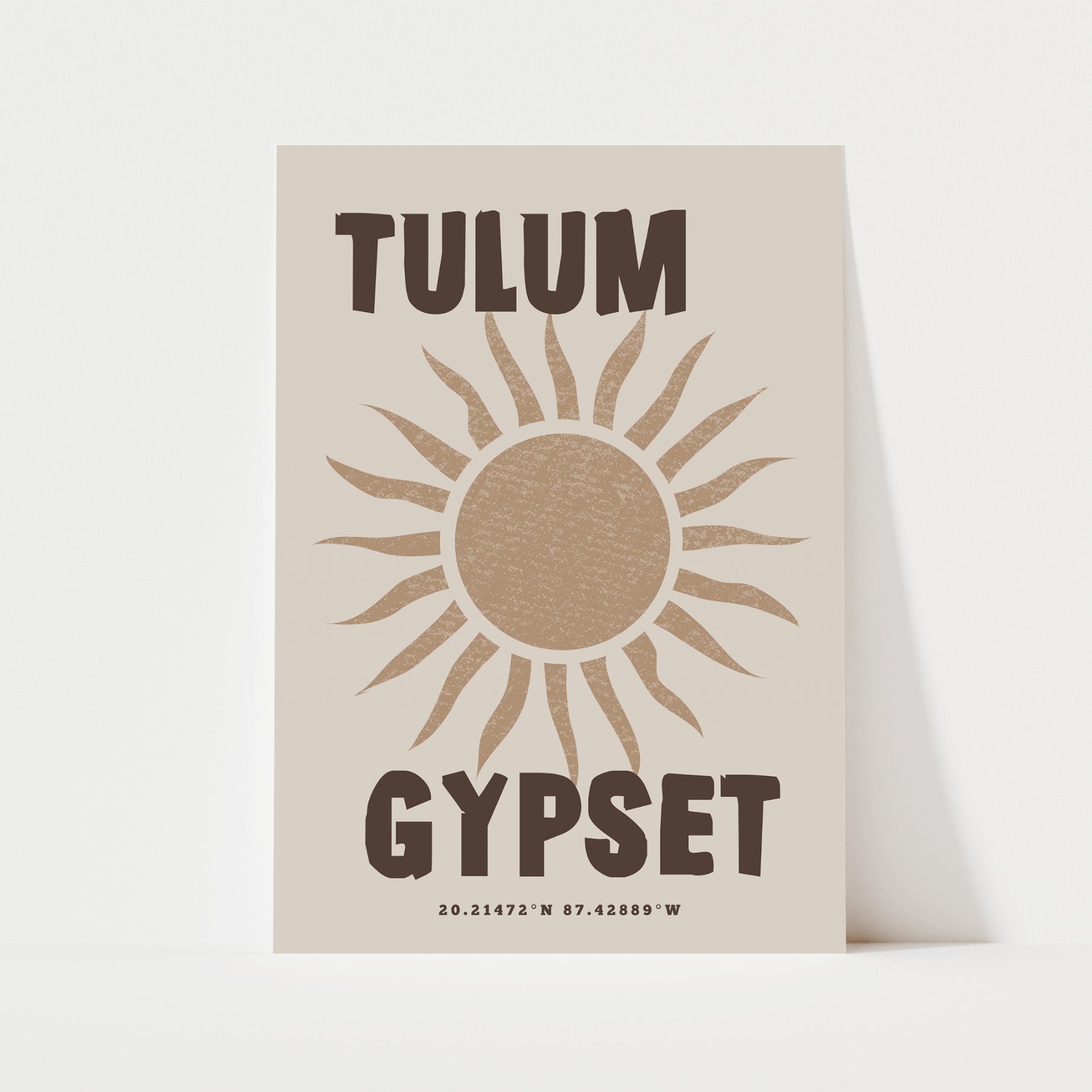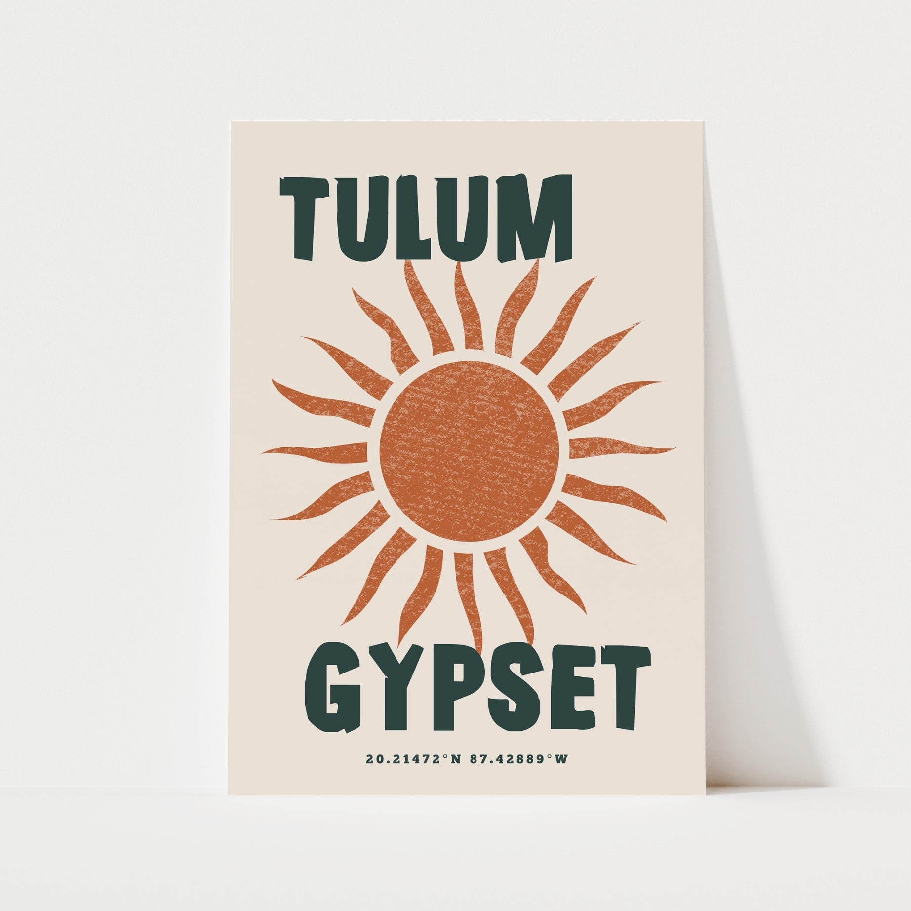 Graphical illustration of the sun with the text "TULUM" above and "GYPSET" below, with coordinates underneath. Available in burnt orange & navy blue, green & pink, or neutral brown tones.