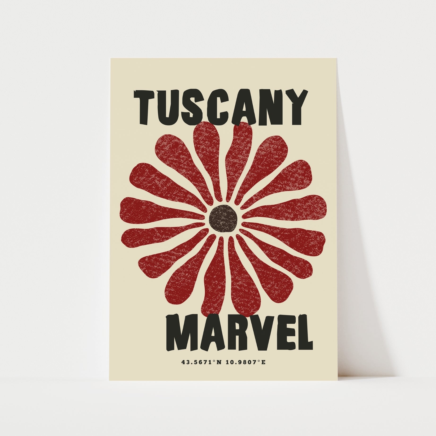 Graphical illustration of a flower with the text "TUSCANY" above and "MARVEL" below, with coordinates underneath. Available in green & pink, burgundy red, or neutral brown tones.