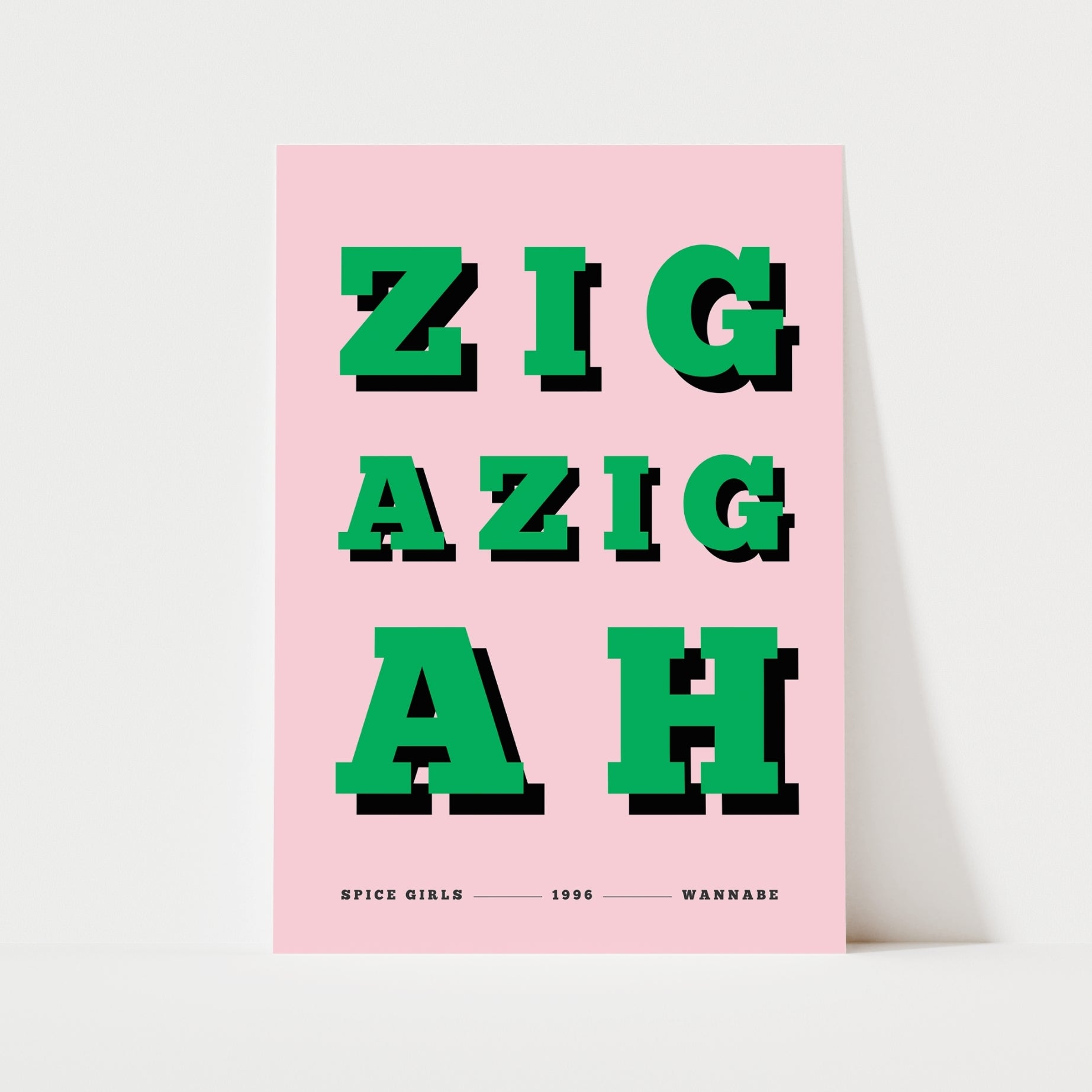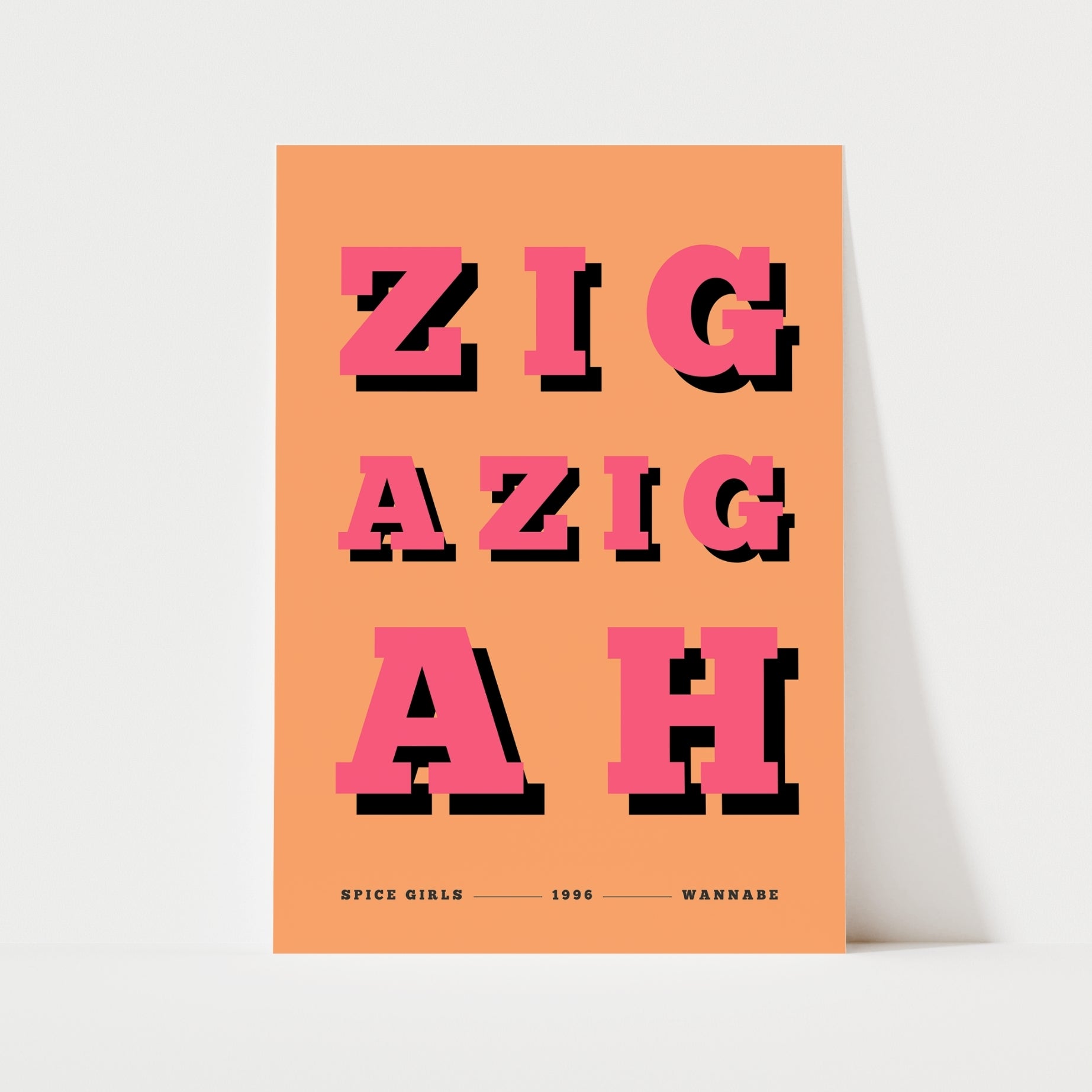 Inspired by the iconic 1990's Spice Girls 'Wanna Be' song, this funky music print has the text "ZIGAZIGAH" in a 3D-effect typography. Available in pink & green, pink & red, red & cream, blue & red, or orange & pink.